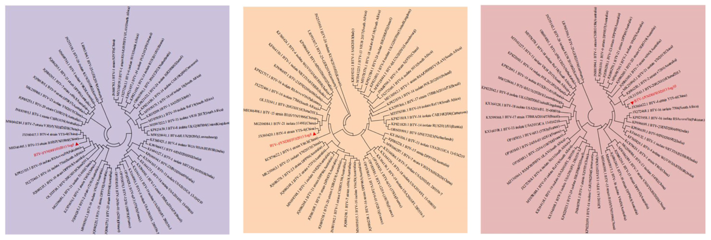 3.3. Reassortment Analysis of BTV-1/YNDH/103/2013