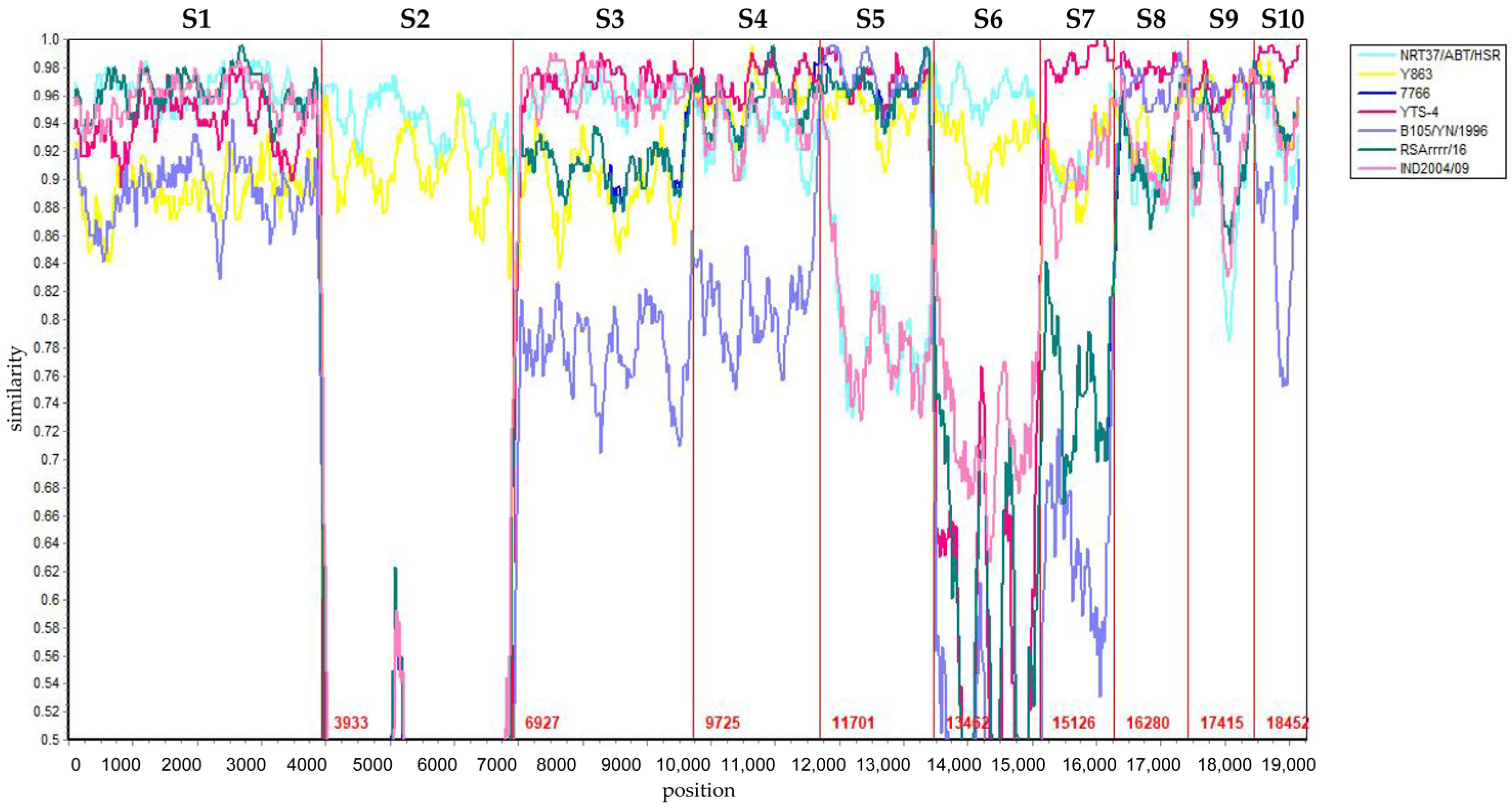 Simplot analysis of eight BTV isolates. BTV-1/YNDH/103/2013 was used as the query. The cyan, yellow, blue, aubergine, blue-purple, green, and pink lines represent the strains NRT37/ABT/HSR, Y863, 7766, YTS-4, B105/YN/1996, RSArrr/16, and IND2004/09, respectively. The Y-axis indicates the degree of sequence similarity, and the X-axis indicates the genomic positions of segments S1 to S10.