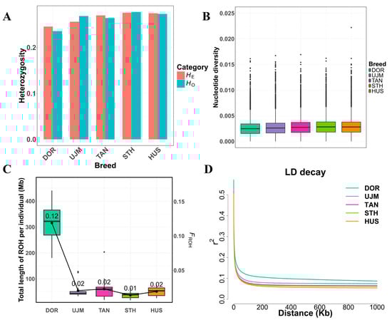 Genetic diversity was assessed in DOR and four Chinese indigenous breeds (UJM, TAN, STH, HUS) using quality-filtered SNPs. The observed heterozygosity (HO) and expected heterozygosity (HE) were estimated in PLINK using the “--hardy” option. Nucleotide diversity (pi) was calculated in VCFtools (v0.1.16) (https://github.com/vcftools/vcftools, accessed on 18 July 2025) with the “--window-pi 50,000 --window-pi-step 25,000” []. Runs of homozygosity (ROH) were identified in PLINK using a sliding window of 50 SNPs, allowing at most one heterozygous genotype and up to two missing calls per window []. ROHs were defined as segments at least 300 kb in length, containing at least 58 SNPs, with a marker density of at least one SNP per 50 kb and no more than 100 kb between consecutive SNPs []. The genomic inbreeding coefficient (FROH) was calculated as the proportion of the autosomal genome encompassed by ROHs for each individual. The inbreeding coefficient based on homozygosity (FHOM) was estimated in PLINK using the “--het” function. Linkage disequilibrium (LD) decay was assessed using PopLDdecay (v3.42) (https://github.com/BGI-shenzhen/PopLDdecay, accessed on 18 July 2025) by computing the squared correlation coefficient (r2) between pairwise SNPs across the genome with default settings [].