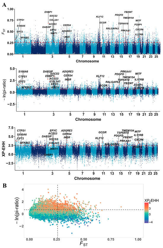 Analysis of the signatures of positive selection in the genome of DOR. Red dotted lines indicate the 5% significance threshold. (A) Manhattan plot of selective sweeps in DOR. (B) Conjoint analysis of the signatures of FST, pi, and XP-EHH of DOR.