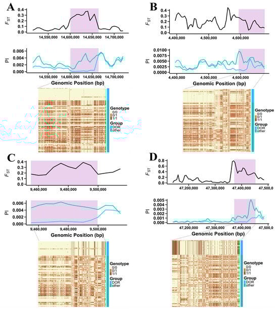 Haplotype and diversity patterns at four candidate genes under selection in DOR and other Chinese indigenous sheep. Each panel presents, from top to bottom, FST, pi, and the haplotype structure of the two groups. The shaded purple regions mark the candidate windows: (A) DAB2IP (chr3: 14,600,468–14,664,440), (B) PDGFD (chr15: 4,593,970–4,675,672), (C) ADGRE3 (chr5: 9,454,819–9,499,632), and (D) EHBP1 (chr3: 47,371,974–47,452,647). In the FST and pi plots, the blue line represents DOR and the cyan line represents other sheep breeds. In the haplotype heatmap, homozygous reference genotypes (0/0) are shown in light yellow, heterozygous genotypes (0/1) in brown, and homozygous alternate genotypes (1/1) in dark brown. Abbreviations: DOR, Dorper sheep; other, four Chinese indigenous sheep (UJM, TAN, STH, and HUS).