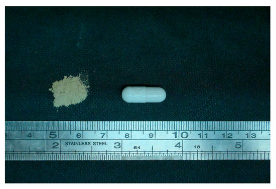 The FMT capsules were manufactured in accordance with our previously established patent (CN118638635A) [30]. In brief, 100 g of fresh donor stool (wet weight) was homogenized with sterile physiological saline using a paddle homogenizer. The resulting suspension was then filtered sequentially through graded meshes (30 μm; 40 μm; 50 μm) to remove particulate matter. The filtrate was then centrifuged at 4000× g for 10 min at 4 °C, and the resulting pellet was collected as the bacterial pellet. This pellet was blended with lyoprotectants (6% trehalose, 20% sucrose, 1% PEG-3350, 1% glycerol, 1% sodium glutamate, 2.5% sodium ascorbate, balance sterile water) at a mass ratio of 1:1.5 and emulsified to homogeneity. The mixture was then lyophilized for 48 h to produce microbial powder, which was pulverized and encapsulated in size 2 enteric-coated capsules (see Figure 1). The final products were stored at 2–8 °C. The total viable bacterial cell count in the FMT capsules is 4.11 × 108 CFU/g. Each capsule contained 100 mg of lyophilized powder, with a viable count of 4.11 × 107 CFU per capsule. The post-lyophilization survival rate exceeded 80%, and viability remained above 80% after 30 days of storage at 2–8 °C.