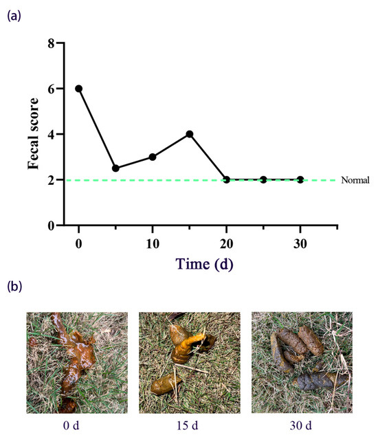 FMT Treatment Protocol. Prior to the present case, a pilot investigation by our team demonstrated that canines weighing kilograms or more who were given four capsules daily achieved better outcomes than those given two capsules daily. It is important to emphasize that this preliminary dosing strategy was exploratory and was not derived from an established or optimized protocol. Based on these findings, Hua Sheng was given four capsules orally each morning on an empty stomach for 30 days. CBC, biochemical analysis, C-reactive protein (CRP), and abdominal ultrasonography were tested at the Teaching Animal Hospital of Sichuan Agricultural University on Days 0, 15, and 30. Before FMT treatment, the recipient underwent a four-week drug-free washout period, which included all antimicrobials, anti-inflammatory drugs, and probiotics. During both the treatment and follow-up phases, the recipient was fed a consistent home-cooked diet (rabbit meat 290 g, potato 40 g, broccoli 25 g, oatmeal 25 g, bok choy 20 g, and flaxseed oil 2 g) and was prohibited from using any probiotics, antibiotics, or other gastrointestinal medications. CBC analysis was performed on venous blood samples (1 mL) and processed using an IDEXX ProCyte Dx analyzer to quantify erythrocyte, leukocyte, and platelet indices. Biochemical profiling was conducted on plasma obtained from heparinized whole blood (2 mL centrifuged at 4007× g for 3 min), with immediate quantification of alanine aminotransferase (ALT), alkaline phosphatase (ALP), blood urea nitrogen (BUN), and CRP levels via an IDEXX Catalyst One system. Ultrasonography was performed by a veterinary radiologist using a high-resolution system (GE Logiq E10 with an ML6-15-D linear probe at 15 MHz). Triplicate measurements were taken to assess the thickness of the gastric wall at the greater curvature (in a fasted state), the duodenal mucosa-submucosa complex in the proximal descending segment, and the jejunal and colonic walls within fluid-filled, non-peristaltic loops. According to the literature, the reference values for the duodenum, jejunum, and colon are 0.3–0.55 cm, 0.24–0.48 cm, and 0.11–0.19 cm, respectively [31]. Fecal samples collected during spontaneous defecation from dogs were cryopreserved at −80 °C for metagenomic and short-chain fatty acids (SCFAs) analysis. Daily fecal morphology was assessed using the validated Bristol Stool Form Scale (scale 1–7) [32].