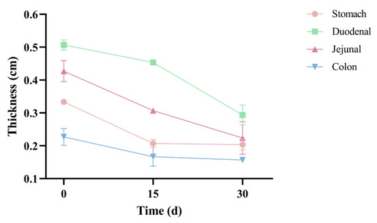 As Figure 4 shows, pre-FMT, the wall thicknesses of the stomach (0.33 ± 0.01 cm), duodenum (0.51 ± 0.02 cm), and jejunum (0.43 ± 0.03 cm) were all within the reference ranges (duodenum: 0.3–0.55 cm; jejunum: 0.24–0.48 cm). Only the colonic wall thickness (0.23 ± 0.03 cm) was outside the reference range (0.11–0.19 cm). Post-FMT, colonic wall thickness (0.16 ± 0.01 cm) returned to the normal range. Our results showed that FMT effectively restored pathological colonic wall thickness to standard physiological levels.