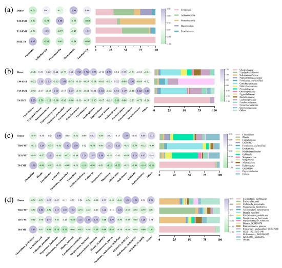 Analysis of intestinal microbial composition. (a) Left panel displays a heatmap of phylum-level abundances (graded blue to purple, indicating low-to-high relative abundance). Right panel shows a horizontal stacked bar chart of phylum composition. (b) Left panel displays a heatmap of family-level abundances. Right panel shows a horizontal stacked bar chart of the top fifteen most abundant taxa of family composition. (c) Left panel displays a heatmap of genus-level abundances. Right panel shows a horizontal stacked bar chart of the top fourteen most abundant taxa of genus composition. (d) Left panel displays a heatmap of species-level abundances. Right panel shows a horizontal stacked bar chart of the top fifteen most abundant taxa of species composition. All heatmaps and horizontal stacked bar charts include donor (baseline) and FMT timepoints (T10, T15, T30).
