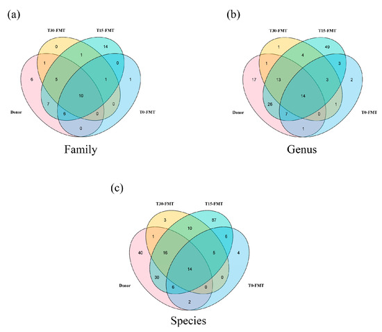 Venn diagrams showcasing the unique and shared microbiota among the donor at baseline and the recipient at T0, T15, and T30. In the Venn diagram, the number within the overlapping circles denotes the count of the shared OTUs. (a) Venn diagram on family level. (b) Venn diagram on genus level. (c) Venn diagram on species level.