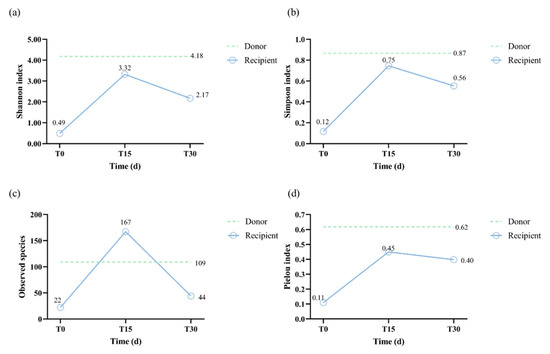 Alpha diversity analysis: (a) the values of the Shannon index; (b) the values of the Simpson index; (c) the values of the observed species; (d) the values of the Pielou index. The values were shown as a blue polyline for the recipient, and the reference values for the donor are shown in dashed green.