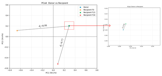 Principal coordinate analysis (PCoA) of the beta diversity of gut microbiota. The left panel shows the full-scale ordination of all samples (PC1 = 58.1%, PC2 = 34.4%; cumulative variance = 92.5%). Solid lines indicate the distances d1 (donor vs. pre-FMT recipient) and d3 (donor vs. T30 recipient). The right panel provides an enlarged view of the red boxed region, revealing clustering of the donor and recipient samples at T15. The distance d2 (donor vs. T15 recipient) is measured under magnification.