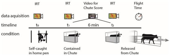 Figure 1 provides a schematic representation of the experimental activities. For each subject, a set of thermal images was collected at a first timepoint (t0), while the bull was housed in its pen and contained in a self-catch head gate, just after being fed, between 9 and 10 AM. Next, bulls were individually taken out of their pen and contained in a squeeze chute in an adjacent hall, out of the sight of their pen mates, for weighing procedures. Upon entrance into the chute (t1), a second set of thermal images was taken. After 6 min (t2) from the beginning of containment, a last set of thermal images was taken, just prior to releasing the bull from the chute. Videos taken during the containment were later used to assess the bull’s behavior, obtain a chute score, and measure flight time, as described in detail below.