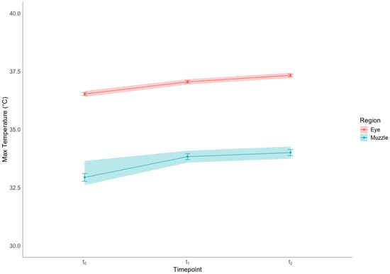 Mean ± SE and 95% confidence intervals (shaded areas) of the maximal temperature recorded in the eyes and the muzzle regions, before restraining in the squeeze chute (t0), immediately after being restrained (t1) and after 6 min of restraint (t2). Increments in temperature between t0 and t1 and between t1 and t2 were statistically significant for both the eye and nose regions (p < 0.001, Bonferroni-corrected post hoc pairwise comparisons after repeated-measures ANOVA).