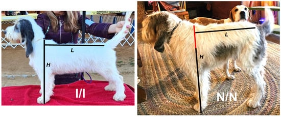 Littermate GBGVs. A dog that had the leg length typical of the breed standard (left) was homozygous for the 18-FGFRG insertion (I/I). Its much taller littermate (right) was homozygous for the allele lacking the insertion (N/N). Height at the withers (H) was measured in each dog and body length (L) was measured as indicated. There was no difference in body length, but the N/N dog was taller by the amount indicated by the red portion of the H line.