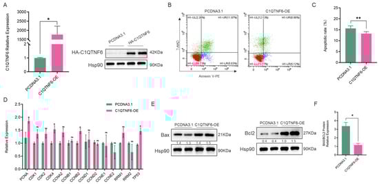 The porcine alveolar macrophages cell line (3D4/21) was used as a cellular model to investigate the potential function of C1QTNF6. We first constructed a C1QTNF6 overexpression vector and confirmed its high transfection efficiency (Figure 2A). Flow cytometry analysis revealed that the overexpression of C1QTNF6 significantly reduced apoptosis in 3D4/21 cells (Figure 2B,C). RT-qPCR analysis revealed that overexpression of C1QTNF6 significantly upregulated the mRNA levels of PCNA, CDK4, CCNB2 and TP53 key cycling factors (Figure 2D), and also up-regulated the expression of anti-apoptotic protein BCL2 (Figure 2E), the ratio of Bax/BCL2 was decreased (p < 0.05) (Figure 2F). These results indicated that the overexpression of C1QTNF6 might enhance the anti-apoptotic effect of 3D4/21 cells.