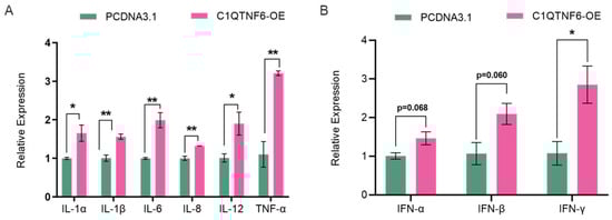 We examined the changes in mRNA expression levels of cytokines in cells after overexpression of C1QTNF6 and found that the levels of pro-inflammatory factors IL-1α and IL-1β were elevated (Figure 3A). These two pro-inflammatory factors are produced by interleukin-1 (IL-1), which binds to specific IL-1 receptors and activates the NF-κB and MAPK signaling pathways through MyD88, IRAK4, and TRAF6, subsequently promoting the transcription of various inflammatory genes [28,29]. Elevated expressions of IL-6, IL-8, IL-12 and TNF-α were involved in the cell immune responses (Figure 3A). Interferons and the interleukin family members are cytokines produced by immune cells, serving as endogenous signals for cell-to-cell interactions. These cytokines can also be secondary to the induction of other cytokines, facilitating interactions among immune cells [30]. Due to the varying degrees of elevation within the interleukin family, we assessed the expression levels of interferons and observed increased levels of IFN-α, IFN-β and a notably elevated level of IFN-γ (Figure 3B).