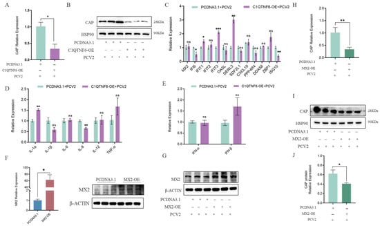 Based on these observations, it is hypothesized that the antiviral activity of C1QTNF6 against PCV2 is mediated, at least partially, through the upregulation of MX2. To test this, MX2 was overexpressed in 3D4/21 cells, resulting in a significant reduction in both Cap gene transcription and Cap protein expression levels of PCV2. This confirms that MX2 exerts a direct antiviral effect against PCV2 infection. Collectively, these findings support the conclusion that C1QTNF6 inhibits PCV2 replication, at least in part, by inducing the expression of MX2 (Figure 7).