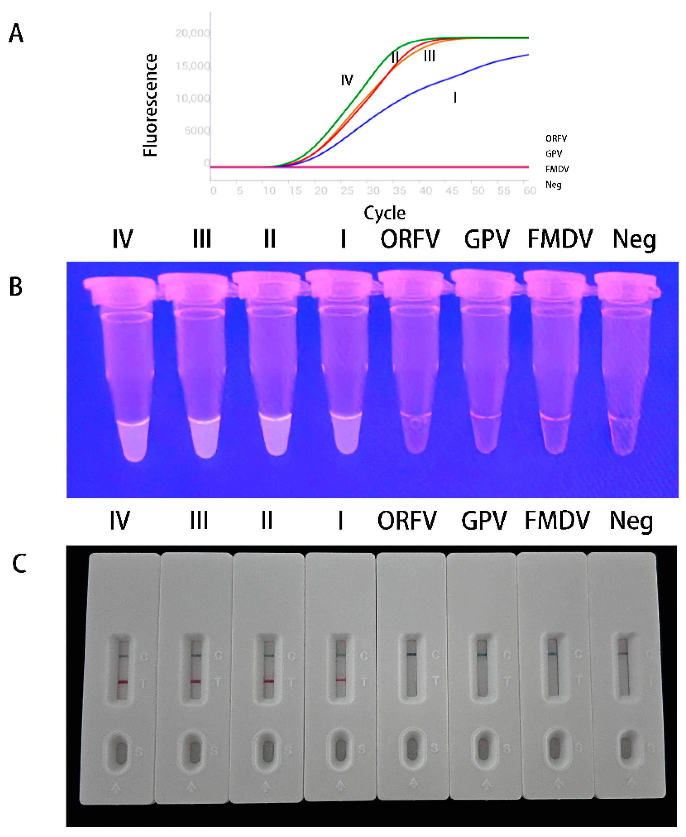 - Cui, H.; Xu, S.; Xu, X.; Ji, J.; Kan, Y.; Yao, L.; Bi, Y.; Xie, Q. Multienzyme isothermal rapid amplification and lateral flow dipstick combination assay for visible detection of chicken chaphamaparvovirus. Poult. Sci. 2023, 102, 103144. [Google Scholar] [CrossRef]