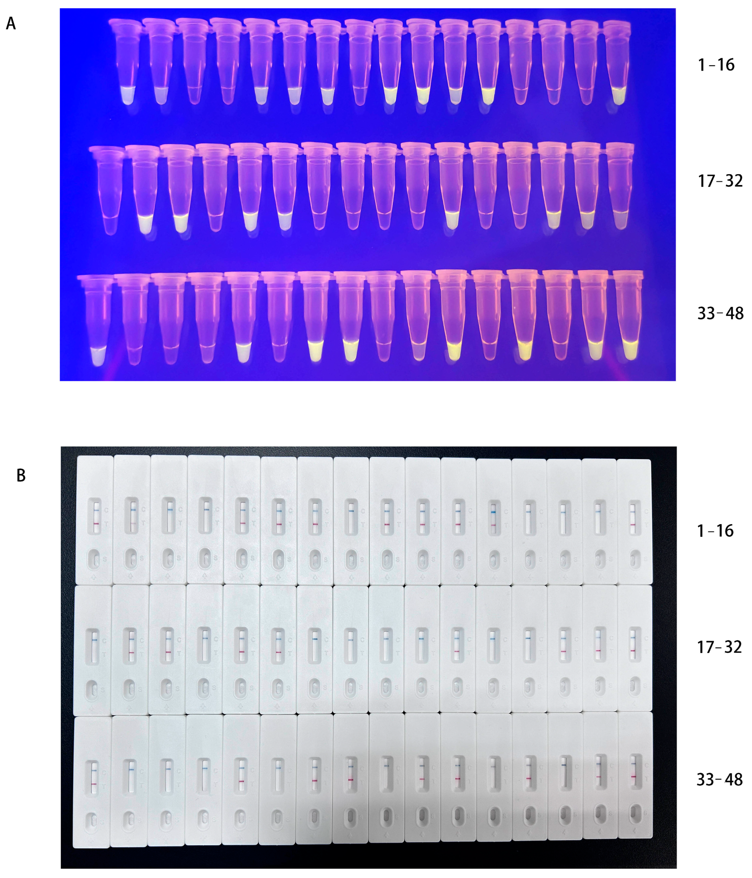 - Zhu, Y.; Chen, L.; Xu, X.; Ye, W.; Ni, Z.; Huo, S.; Hua, J.; Yun, T.; Yao, H.; Wang, H.; et al. Development of a multienzyme isothermal and lateral flow dipstick combination assay for the rapid detection of goose astrovirus II. Front. Cell. Infect. Microbiol. 2024, 14, 1424212. [Google Scholar] [CrossRef] [PubMed]