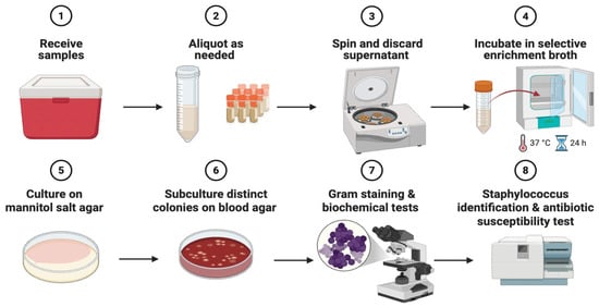 Processing of wastewater samples for detection of Staphylococcus species (Created in BioRender https://app.biorender.com/illustrations/68eead61fb09907b6cbc4512 accessed on 27 October 2025).