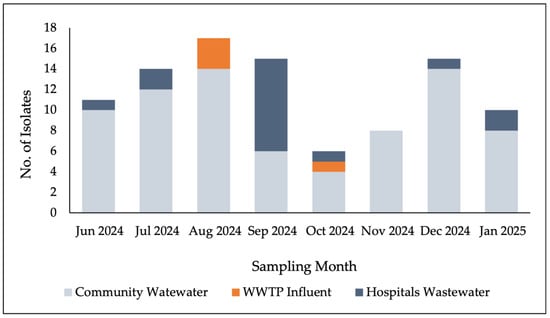 A total of 96 staphylococcal isolates were recovered from three wastewater sources: hospital wastewater, community wastewater, and WWTP influent. The number of captured isolates per month ranged from 6 to 17, with no statistically significant difference across months (p = 0.28). Of these 91.7% (n = 88) were coagulase-negative staphylococci (CoNS) and 8.3% (n = 8) were coagulase-positive S. aureus (CoPS), yielding a CoNS:CoPS ratio of approximately 11:1. No staphylococci were detected in WWTP effluent samples. The highest number of isolates were obtained from community wastewater (n = 67), followed by hospital wastewater (n = 16), while only 4 isolates were recovered from WWTP influent (Figure 2).