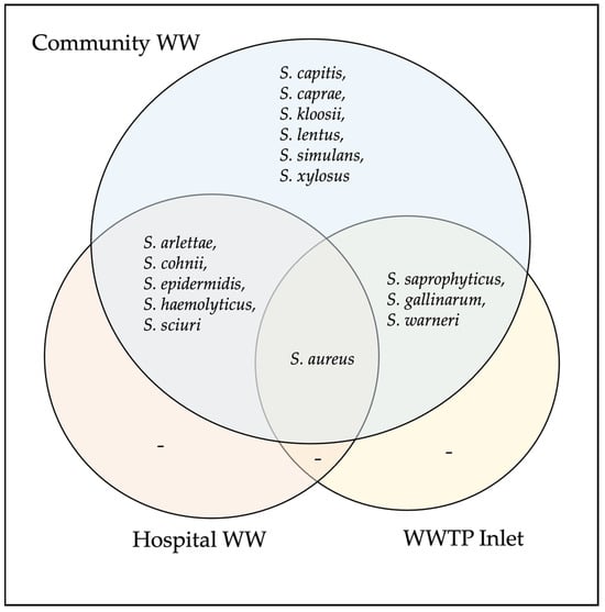 Venn diagram showing the distribution Staphylococcus species detected across different wastewater sources.