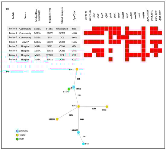 Population structure and antimicrobial resistance genes of S. aureus isolates from wastewater. (a) Heatmap showing the distribution of AMR genes across eight S. aureus genomes, alongside isolate metadata (source, methicillin phenotype, ST, clonal complex, and spa type). Red cells indicate presence of the listed determinant; white cells indicate absence. (b) Core genome multilocus sequence typing (cgMLST) comparison of S. aureus isolates based on 1861 gene loci. cgMLST minimum-spanning tree of all S. aureus isolates (including both MSSA and MRSA) identified in the study.