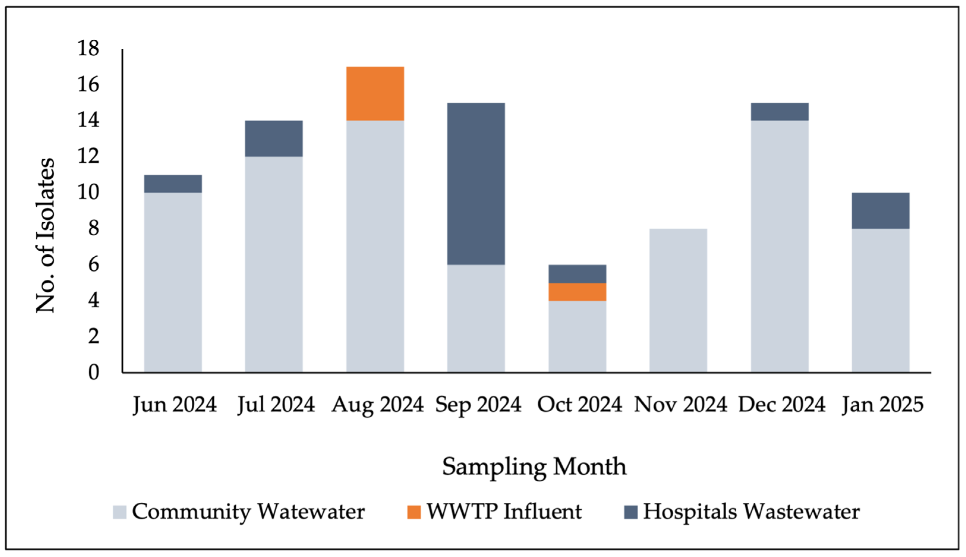 - Velazquez-Meza, M.E.; Galarde-Lopez, M.; Cornejo-Juarez, P.; Carrillo-Quiroz, B.A.; Velazquez-Acosta, C.; Bobadilla-Del-Valle, M.; Ponce-de-Leon, A.; Alpuche-Aranda, C.M. Multidrug-Resistant Staphylococcus sp. and Enterococcus sp. in Municipal and Hospital Wastewater: A Longitudinal Study. Microorganisms 2024, 12, 645. [Google Scholar] [CrossRef]