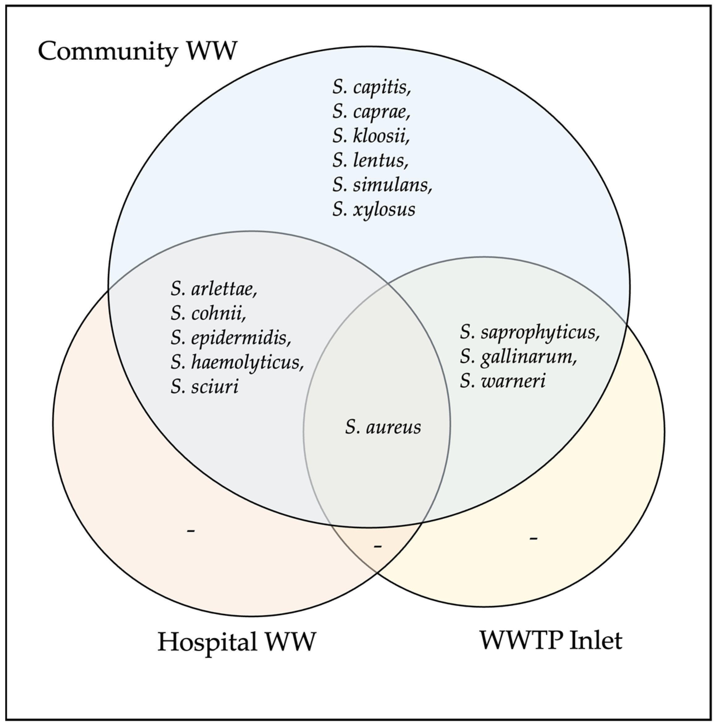 - Gomez, P.; Lozano, C.; Benito, D.; Estepa, V.; Tenorio, C.; Zarazaga, M.; Torres, C. Characterization of staphylococci in urban wastewater treatment plants in Spain, with detection of methicillin resistant Staphylococcus aureus ST398. Environ. Pollut. 2016, 212, 71–76. [Google Scholar] [CrossRef]