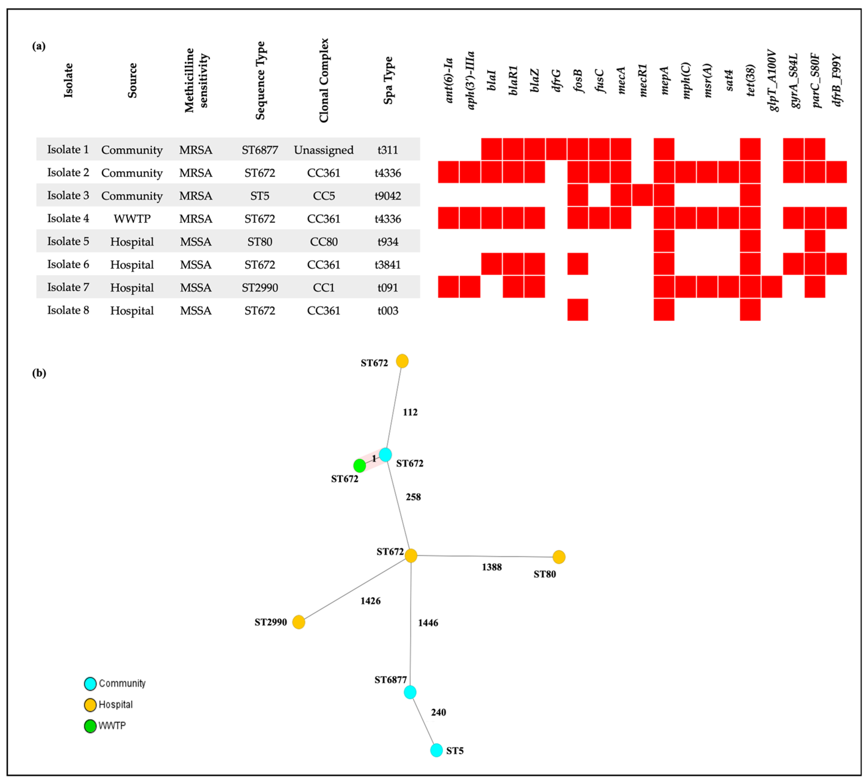 - Muneeb, K.H.; Sudha, S.; Sivaraman, G.K.; Ojha, R.; Mendem, S.K.; Murugesan, D.; Raisen, C.L.; Shome, B.; Holmes, M. Whole-genome sequence analysis of Staphylococcus aureus from retail fish acknowledged the incidence of highly virulent ST672-MRSA-IVa/t1309, an emerging Indian clone, in Assam, India. Environ. Microbiol. Rep. 2022, 14, 412–421. [Google Scholar] [CrossRef]