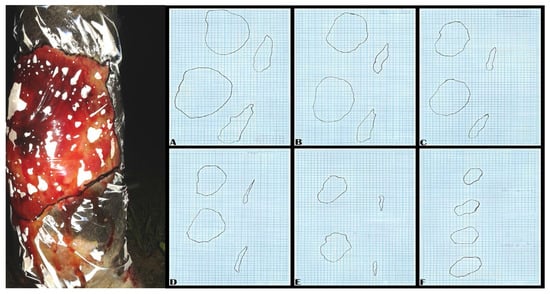 Wound areas were recorded at each session by tracing their perimeters onto transparent plastic foil and transferring them to millimetric paper for surface measurement, as shown in Figure 2 [16]. The wound areas were expressed in square centimeters (cm2).