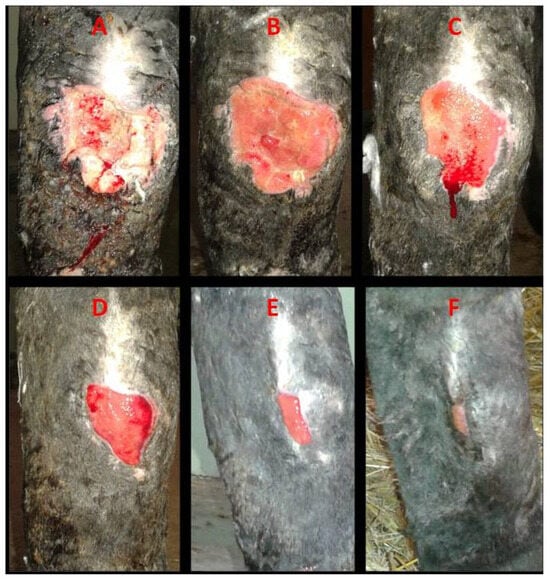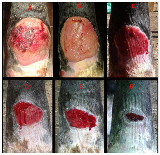 Case 2. A macroscopic evaluation of a chronic circular atonic wound on the palmar aspect of the left forelimb fetlock: (A)—day 0, exuberant granulation tissue with superficial necrotic debris; (B)—day 7, reduced granulation tissue and onset of contraction; (C)—day 14, leveled granulation tissue with early epithelialization; (D)—day 28, active epithelialization; (E)—day 36, continued epithelial progression; (F)—day 44, advanced epithelialization with near-complete surface coverage.