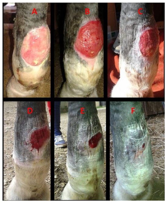Case 1. Healing progression of a hypertrophic dorsal fetlock wound on the left forelimb: (A)—day 0: atonic wound with exuberant granulation tissue with superficial necrosis; (B)—day 7, reduction in granulation tissue with early contraction; (C)—day 14, leveled granulation tissue with initial epithelialization; (D)—day 28, progressing epithelialization; (E)—day 36, continued epithelial advancement; (F)—day 44, advanced epithelialization with a marked reduction in wound area.