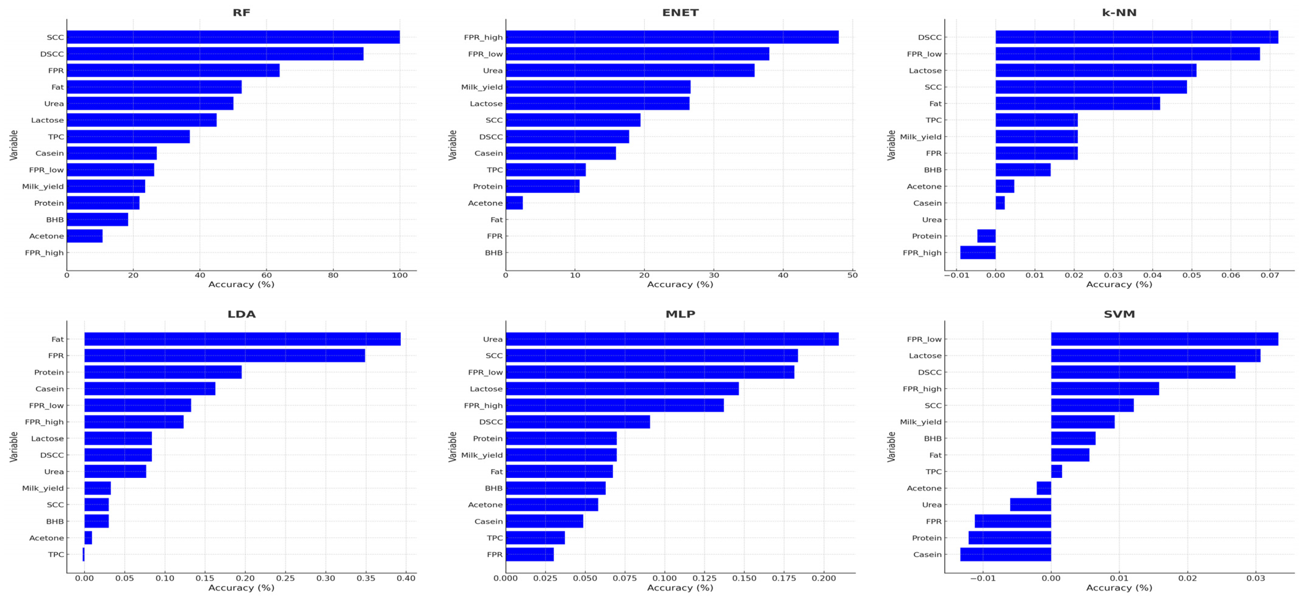 The RF model ranked SCC, DSCC, FPR, fat and urea among its most influential variables. SVM and MLP assigned high importance to DSCC, lactose, and urea. The k-NN and LDA placed greater importance on FPR and lactose.