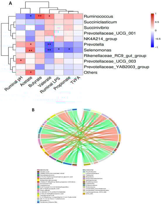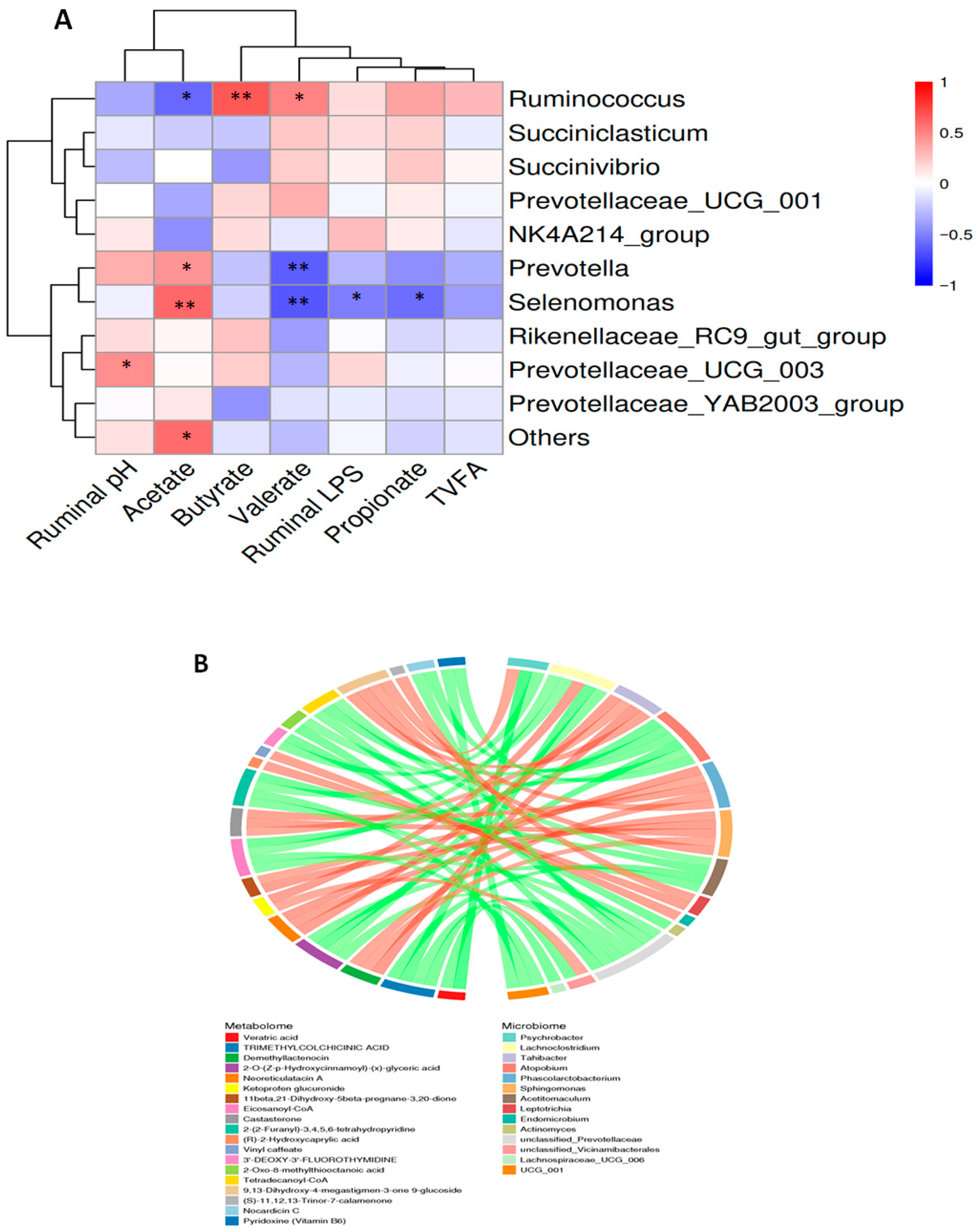 3.8. Correlation Analysis Between the Ruminal Fluid Parameters, Microbiome, and Metabolome in Dairy Goats