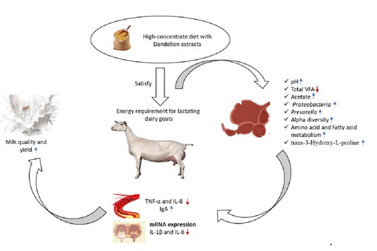 - Zhang, Y.; Mgeni, M.; Xiu, Z.; Chen, Y.; Chen, J.; Sun, Y. Effects of Dandelion Extract on Promoting Production Performance and Reducing Mammary Oxidative Stress in Dairy Cows Fed High-Concentrate Diet. Int. J. Mol. Sci. 2024, 25, 6075. [Google Scholar] [CrossRef]