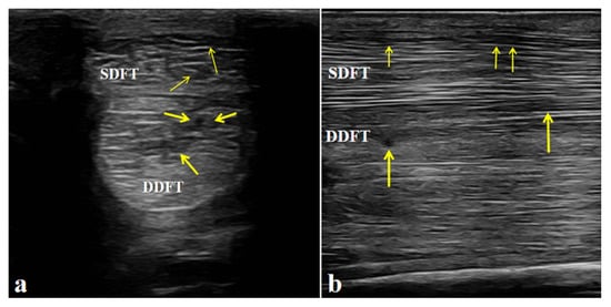 Ultrasonographic features of the affected horse with flexor tendinitis. (a) Transverse sonograms of the superficial digital flexor tendon (SDFT) and deep digital flexor tendon (DDFT) (yellow arrow: lesion sites). (b) Longitudinal sonograms of the SDFT and DDFT (yellow arrow: lesion sites). Arrows indicate the sites of tendon injury.