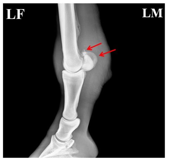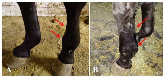 Post-treatment conditions of affected horse. (A,B) Complete healing of medial and lateral proximal sesamoid bone fractures, with resolution of swelling in the metacarpophalangeal joint and flexor tendons. The arrows indicate the specific lesions.