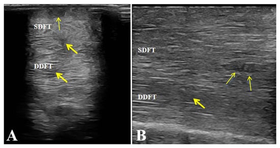 Post-treatment ultrasonographic images of the affected horse. (A,B) Increased echogenicity and uniform fibrillar alignment of the superficial digital flexor tendon (SDFT) and deep digital flexor tendon (DDFT), without fibrosis or adhesions. Arrows indicate the repaired areas of the tendon post-treatment.