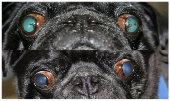- Labelle, A.L.; Dresser, C.B.; Hamor, R.E.; Allender, M.C.; Disney, J.L. Characteristics of, Prevalence of, and Risk Factors for Corneal Pigmentation (Pigmentary Keratopathy) in Pugs. J. Am. Vet. Med. Assoc. 2013, 243, 667–674. [Google Scholar] [CrossRef]