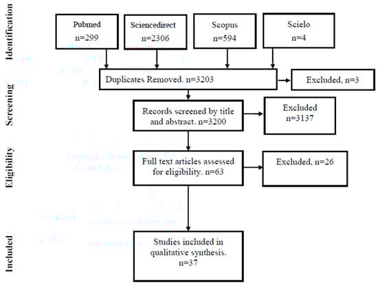 A total of 3203 records were identified in the databases (ScienceDirect, 2306; PubMed, 299; SciELO, 4; Scopus, 594). After removing duplicates (n = 3), 3200 records remained for title/abstract screening, of which 3137 were excluded because they did not meet the eligibility criteria. Sixty-three reports were retrieved (n = 0 not retrieved). Sixty-three full-text reports were assessed, of which twenty-six were excluded for documented reasons. A total of thirty-seven sources of evidence were included in the synthesis (Figure 1 PRISMA-ScR diagram).