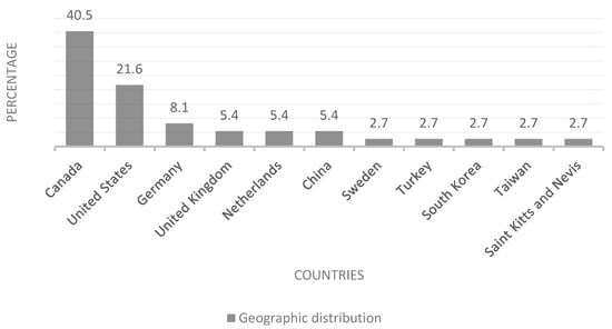 Of the 37 articles analyzed, there was a marked concentration of publications from English-speaking countries and the Northern Hemisphere. Figure 2 shows that most of the articles came from Canada (40.5%) [1,11,15,16,17,18,19,20,21,22,23,24,25,26,27] and the United States (21.6%) [28,29,30,31,32,33,34,35], which together accounted for more than 60% of the total. Other countries that contributed publications to the analysis included Germany (8.1%) [36,37,38], the United Kingdom (5.4%) [39,40], the Netherlands (5.4%) [41,42], China (5.4%) [7,43], and, to a lesser extent, Sweden [44], Turkey [45], South Korea [46], Taiwan [47], and Saint Kitts and Nevis [48], each with a 2.7% representation (Figure 2 Geographic origin of the studies).