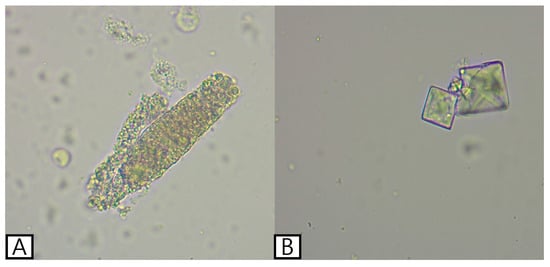 Urine sediment examination showing a granular cast (A) and calcium oxalate crystals (B) in the present case.