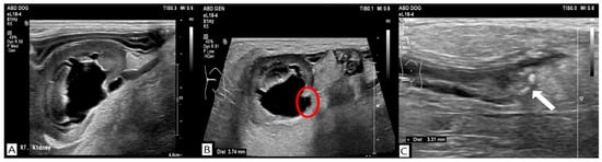 Ultrasonographic findings on day 4 revealed severe dilation of the right renal pelvis (A), distention of the right ureter (red circle) (B), and the presence of ureteral calculi (white arrow) (C).