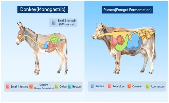 The modern donkey originates from the Equus africanus and belongs to the family Equidae of mammals [27]. Donkeys primarily consume high-fiber, low-energy diets, and their nutritional requirements for energy and protein are significantly lower than those of horses. Unlike other herbivores such as cattle and sheep, donkeys are non-ruminant, single-stomached herbivores and do not possess a rumination mechanism. Moreover, the stomach capacity of a donkey is relatively small, amounting to only about one-fifteenth that of a cow of comparable body size. Donkeys possess a highly developed cecum, which plays a central role in the digestion and absorption of nutrients. Due to physiological differences from ruminant animals, donkeys exhibit distinct feeding behaviors compared to other herbivores. Both donkeys and horses are non-ruminant herbivores, relying on hindgut fermentation to digest dietary fiber, whereas ruminants such as cattle and water buffalo utilize foregut fermentation in the rumen to break down fiber. This fundamental difference means that non-ruminants have less opportunity to absorb the end products of fiber digestion compared to ruminants are shown in Figure 1.
