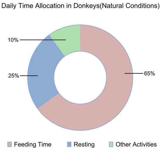 Given adequate feeding time, ruminants such as cattle can consume dry matter equivalent to approximately 2% of their body weight per day when fed the same type of roughage. In comparison, donkeys typically consume dry matter amounting to 2.0–2.5% of their body weight, while large horses may consume 2.5–3%. Overall, donkeys consume about 25–30% less feed than horses. However, donkeys exhibit higher digestive efficiency for low-quality roughages compared to horses. When fed highly digestible, high-quality forages such as alfalfa, the difference in nutrient utilization between donkeys and horses is minimal. In contrast, when fed low-quality forages such as corn stalks or barley straw, donkeys demonstrate up to 30% higher fiber digestibility than horses. The underlying reasons for these differences are not yet fully understood; however, two factors have been well established through research. First, there are notable differences in the microbial populations present in the hindgut. Second, donkeys have a proportionally larger gastrointestinal tract relative to body volume, which enhances their ability to digest fibrous forages. Traditionally, the belief that donkeys are “easier to feed” than horses was attributed to their lower dietary intake requirements. In fact, there is no substantial quantitative difference between donkeys and horses in terms of their energy and protein requirements. Under natural or grazing conditions, donkeys typically spend the entire day and part of the night—usually between 14 and 16 h—searching for and consuming feed are shown in Figure 2 [27]. Donkeys have higher feed selection requirements, and when suitable feed is not found, they typically continue searching for appropriate forage. Research has demonstrated that equids tend to prefer stems over leaves, meaning they select for fiber. Observations on the foraging behaviors of Burchell’s zebra and the wildebeest showed similar preferences for fibrous materials. Equids, compared to ruminants, tend to select more stems as feed [27]. Since donkeys lack a rumination mechanism, restricting their feeding time results in an increase in their digestive coefficient and a slower average retention time compared to ad libitum feeding. Additionally, donkeys have a high nitrogen recycling capacity [12]. The donkeys spend more time chewing and have longer feeding durations. They feed slowly and exhibit strong adaptability to different types of forage. Under natural conditions, donkeys can meet their nutritional needs by consuming low-quality, fibrous roughage, with feeding durations lasting 14 to 17 h [28].