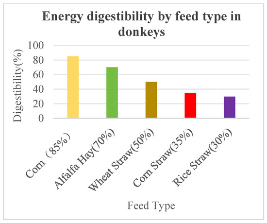 Roughage is a primary feed source for donkeys and plays a crucial role in donkey husbandry [29]. The production and utilization of roughage are essential for ensuring the health and performance of donkeys. Common types of roughage in donkey husbandry include fresh grass and crop residues [30]. Roughage is characterized by its high crude fiber content and relatively low digestibility. The crude fiber content of roughage generally ranges from 25% to 50%, with hay typically containing lower levels around 25% to 30%. The digestibility of organic matter in roughage is generally below 70%. Despite its high crude fiber content and low nutritional value, roughage remains vital for herbivorous livestock, especially in winter when it becomes the primary feed. While its nutritional value is low in terms of energy, it helps maintain livestock nutrition [31]. The digestibility of different feeds by donkeys is shown in Figure 3 [32]. The protein content in roughage varies considerably due to the wide range of feed types, preparation methods, and other factors [33]. For instance, legume hays contain 10% to 19% crude protein, while grass hays contain 6% to 10%. In contrast, the crude protein content in grass straw and chaff is only 3% to 5%. The digestibility of protein is also higher in legume hay than in straws and chaff, with alfalfa hay exhibiting a protein digestibility rate of 71%, compared to 50% for grass hay and 15% to 20% for straws. Regarding mineral content, roughage generally has a higher calcium content, with legumes and straw containing around 1.5% calcium, while grass hays and straw contain only 0.2% to 0.4%. Phosphorus content in roughage is generally low, ranging from 0.1% to 0.3%, with straw-based feeds containing less than 0.1% phosphorus. The vitamin content in roughage is also variable, with high-quality hay, especially legume hay, containing substantial amounts of carotene and vitamin D, whereas most straws and chaff are nearly devoid of carotene and B vitamins.