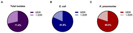 Proportion of MDR among Gram-negative isolates, E. coli; K. pneumoniae; P. aeruginosa; P. mirabilis; S. flexneri; and E. hormaechei. (A) Gram-negative isolates (n = 21); (B) E. coli isolates (n = 11); (C) K. pneumoniae isolates (n = 5).