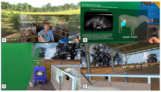 The MR-trained group (n = 19) received 30 min of individual training on the Ewe Scan app (developed by the University of Sydney research team, Sydney, NSW, Australia) on the Apple Vision Pro (Apple Inc., Cupertino, CA, USA). The students received a brief device orientation (3–5 min), explaining the hand commands as well as setting up personalized eye and hand tracking. This orientation was directed by a researcher with ultrasound scanning expertise and trained in Apple Vision Pro demonstration. The app guided the students through 3 stages of learning: an introductory video, an interactive 3D anatomical model explanation, and an interactive ultrasound simulation. As previously mentioned, the introductory video was the same as the one shown to the lecture-trained group. Although, the MR-trained group viewed the video from within the app in a spatial immersive, virtual paddock environment, shown in Figure 1A. The second stage displays a 3D model of a sheep which the students could interact with and move to view from any direction, shown in Figure 1B. The 3D model had three alternate versions, not pregnant (empty), pregnant with a single fetus, or pregnant with twin fetuses. Accompanying the 3D model were a number of key fetal structures that students could select and read about in more detail including the placentome, uterine wall, fetal skull, and amniotic sac. Selecting each structure displays the structure anatomically in 3D, 2D on ultrasound imagery, and a written description of visual traits of this structure. During the third stage of the app, shown in Figure 1C, the student is placed in a virtual environment where they can practice pregnancy scanning a virtual 3D sheep. This stage displays a typical sheep pregnancy scanning environment on farm, with a pregnancy scanning crate holding a sheep on the right side of the student and an ultrasound machine in front the student, displayed in Figure 1D. As students position the virtual probe on the sheep and begin to maneuver their hand, the ultrasound image updates dynamically based on their hand position. This allows students to practice probe positioning as well as understanding the spatial context of interpretating a 2D ultrasound image from the 3D anatomy of the sheep. A short demonstrative video of the Ewe Scan mixed reality app is provided as Supplementary Video S1.