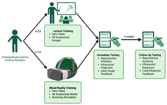 A total of 51 first-year animal science undergraduate students enrolled in the Animal and Veterinary Bioscience (AVBS) course at the University of Sydney expressed interest in this study. Eligibility for this study was determined by a screening questionnaire using Research Electronic Data Capture (REDCap; Vanderbilt University, Nashville, TN, USA; version 14.3.13) hosted at the University of Sydney, a secure web-based application developed for data collection from participants for research studies [13]. Students were only accepted to this study if they had no prior ultrasound pregnancy diagnosis experience, no prior reproductive anatomy knowledge, and were willing to participate in both days of the study. Eligible and accepted students were randomly assigned to one of two groups: lecture-trained (control group) or MR-trained (experimental group).