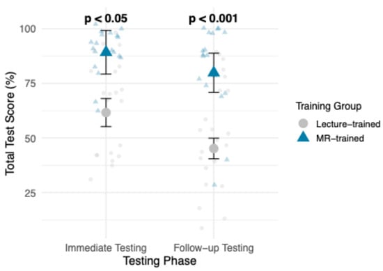 The emmeans analysis further supported this finding, demonstrating that the MR-trained group had higher estimated marginal means during both testing phases, shown in Figure 3. The pairwise contrast analysis between training groups revealed a significant difference between groups at both time points. During Immediate Testing, MR-trained students significantly outperformed lecture-trained students (82.9% vs. 61.6%, p = 0.0155). This trend continued in Follow-Up Testing, with increased significance (79.8% vs. 45.2%, p = 0.0002).