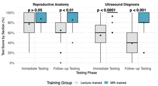 Boxplots demonstrating test score (%) by section, Reproductive Anatomy and Ultrasound Diagnosis, compared between lecture-trained and MR-trained groups, across testing phases. Boxes represent the interquartile range, with the horizontal line indicting the median; whiskers extend to the minimum and maximum values, and individual points represent outliers. Mean annotated with a green diamond point. p-values from Wilcoxon rank-sum tests comparing training groups are shown for each testing phase.