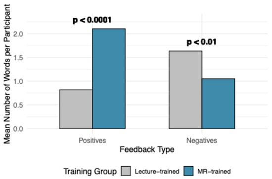 The number of positive and negative descriptors used per student was analyzed and summarized in Figure 7. The MR-trained group reported significantly more positive descriptors than the lecture-trained group (p < 0.0001). Conversely, the lecture-trained group used significantly more negative descriptors compared to the MR-trained group (p < 0.01). The total number of descriptors used also differed between groups, with the MR-trained group providing more positive words and the lecture-trained group providing more negative words (p < 0.001).